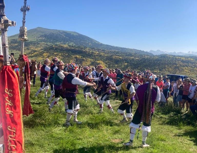 Suena chiflo y salterio en o monte de Yebra de Basa. Comienzan a oírse las campanas desde el punto de la mañana. Devoción pirenaica a Santa Orosia, que como cada junio reúne con palo, ropón y sombrero, a unos cuarenta romeros procedentes de Guarguera, Galliguera media, Valle Mangueta y La Sotonera.